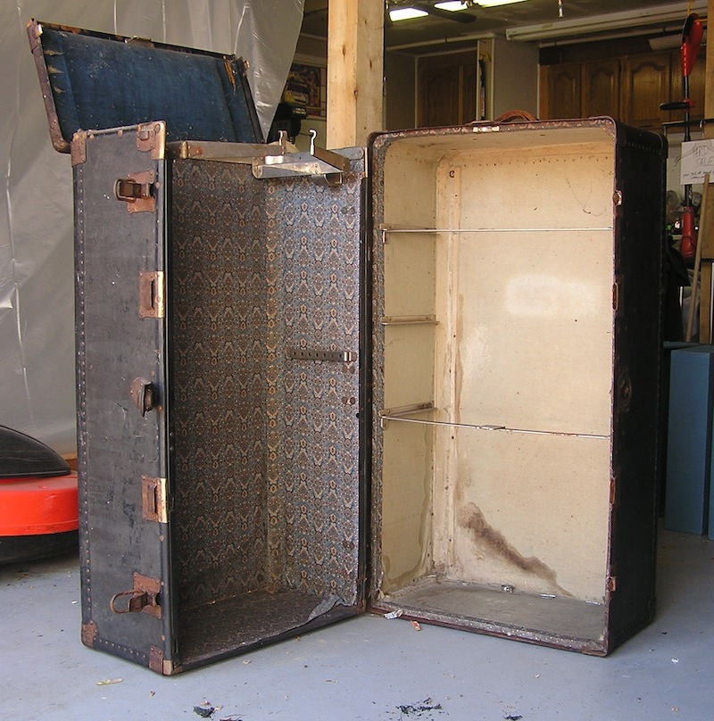 We recently posted a photo of an old wardrobe trunk on our Facebook page and asked our friends to guess what it was going to be. One of our friends commented that they thought it was pretty awesome just as it was. We tend to agree when it comes to old trunks, we own about 8 of them, but this particular trunk is in pretty rough interior condition. It is missing all of its internal bits such as the drawers, hangers, shelves, shoe box, and anything else it might have contained. It was pretty beat up on the outside as well, with a few of its sides showing cracks and warping. And, as most of the old trunks you find, it needs its lock latch replaced. No one would be storing anything in this without some major overhaul work. Thus, we feel justified in turning it into something other than a wardrobe trunk so it can continue its life as a useful thing.