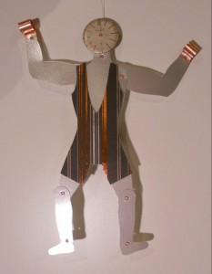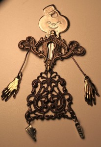 K’s contribution for Day 17 was a Found Object Clown that I am calling “Mr. Brassy Bottoms.” Mr. Brassy Bottoms’s head is an old “American Tourister” key. His body is a key hole/escutcheon and a brass filigree. His hands and feet are some pewter shoe charms, some brass wire, and some brass hand charms. (Sadly, he has 2 right hands, and he is left-handed. Poor Mr. Brassy Bottoms.) He was an ephemeral art piece, because I have other plans for all of the pieces that make him up. He was fun while he lasted!