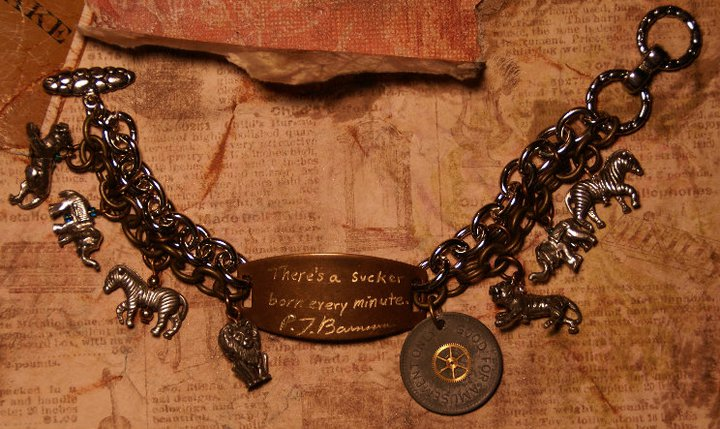 As soon as K saw that old “Good for Amusement Only” token at the antique store, she knew it had to be part of a circus bracelet. I used an engraving pen to etch the famous quote generally (and possibly erroneously) attributed to Victorian-era circus titan P.T. Barnum, “There’s a sucker born every minute.” and a forgery of Barnum’s actual signature. The bracelet just begged for a menagerie of exotic animal charms. Owing to the amount of solid metal, this bracelet has great weight and movement to it.