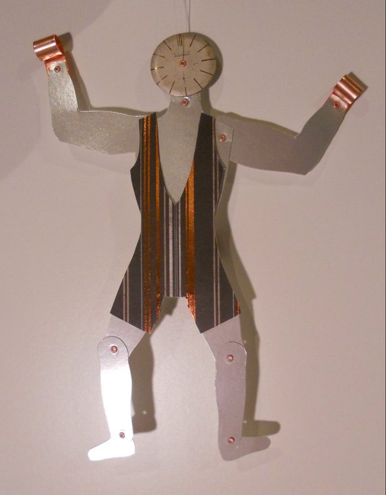 Today, we decided to make some paper puppets for our Clockwork Circus Doll Theater. I think M might actually be beginning to like working with tools, as she used the metal punch, bail pliers, and a grommet setter to make her paper strongman.