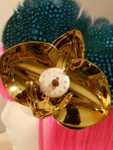 M stepped firmly outside her comfort zone and used tools on this one! Yep, I laid down the scissors and needle & thread and picked up snips, wire, an X-Acto knife, and a glue gun. I started with two premade feather hair clips and a plastic metallic orchid left over from a past Christmas display. Using the X-Acto knife I removed the clips from the feather pieces and arranged them as I wanted them, then glued them together. I took the metallic orchid apart using the snips and used wire to put it back together with the clock face and the red bead to accent the center of the flower. Then I used a special pin back with holes in it to pull the wire through and hold it all together. K was very patient in helping me pick out the right tools and watching over the accident prone one of us (me!) to ensure safety at every step.