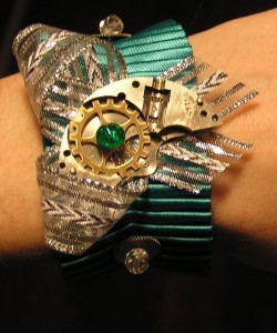 M was inspired by the yards of this awesome aqua ruffle ribbon she had stashed away. I decided to make a cuff bracelet worthy of a circus performer to wear in her downtime when going out on the town post-show (as girls like a little bling and performers usually take a bit of their stage persona with them wherever they go). I hand stitched all the attached baubles including some vintage buttons, an old watch part, a copper gear and some other watch parts with sparkly beads. It isn’t perfect, but as a first attempt I can’t complain too much about how it turned out.