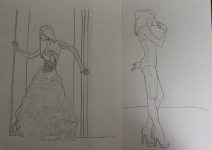 K got started on two separate drawings, but decided she wasn’t entirely happy with either one. The proportions on the circus performer looked all wrong to me. The other drawing is not exactly steampunk or circus, but here’s the story I made up to go with it: She’s a young, Victorian lady with contacts and prospects, but her heart is with the circus, and in this photo, she is stealing away to join the merry band of carnies passing through her town.