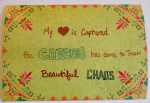M wrote a Circus Haiku very very late at night and thought it was brilliant! I put it to this pretty paper the next morning to jazz it up a bit as it turned out to not be brilliant after all. Please excuse my sleepy ego and terrible handwriting.