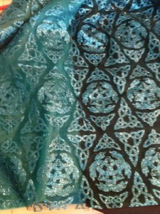The appeal of the Merida costume was a specific chunk of fabric used in the skirt that was a gorgeous teal colored tulle covered in glittery tonal Irish knot work. The goal was to turn that skirt (Kara is a very petite lady) into something she could dance in and wear on other occasions (maybe even on stage with her band). After several FB convos and a Skype video, M asked Kara to just mail the dress to her and she would see what she could do.