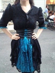 The top was still an issue and M took it upon herself to make a jacket, that would match and be usable separately – because what is better than one outfit? An outfit that can be broken up and worn in many ways! Using the same satin and the same lace as the skirt, M made a 3/4 sleeve jacket of the lace overlaid on the satin. Up close, it almost looks like brocade, but it isn’t. That was a fun, and completely unexpected, trick! The jacket was lightweight enough to not bake Kara under the stage lights, but still sturdy enough to stand up to wear in other conditions.