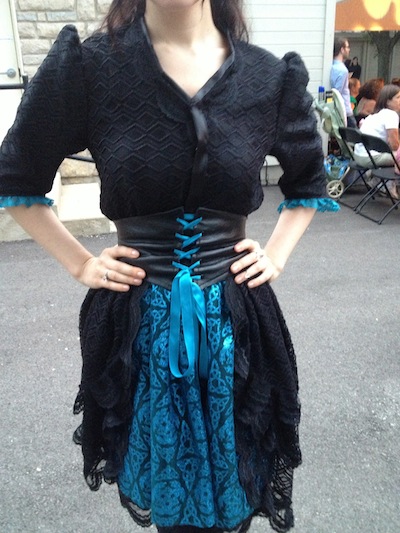 Our lovely and talented friend Kara Markley (of the band Lone Raven, and Official FrenzyGal inductee), was competing in her first Irish Dance Feis at the Dublin Irish Festival in August. She was also performing with her band several times in the same weekend. She contacted M for help with converting a child’s Merida costume into her dance dress.