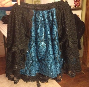 M was apprehensive, but Kara gave her editorial and design control over the conversion, which made it easier to let her imagination fly and experiment. In completely disassembling the skirt to rescue the fabulous fabric, the skirt was completely redesigned with a black satin base and black lace layers that really made the aqua fabric pop. The skirt was a new challenge because it incorporated pleats and an elastic waistband, not things that usually end up together. It turned out smashingly, if we do say so ourselves.