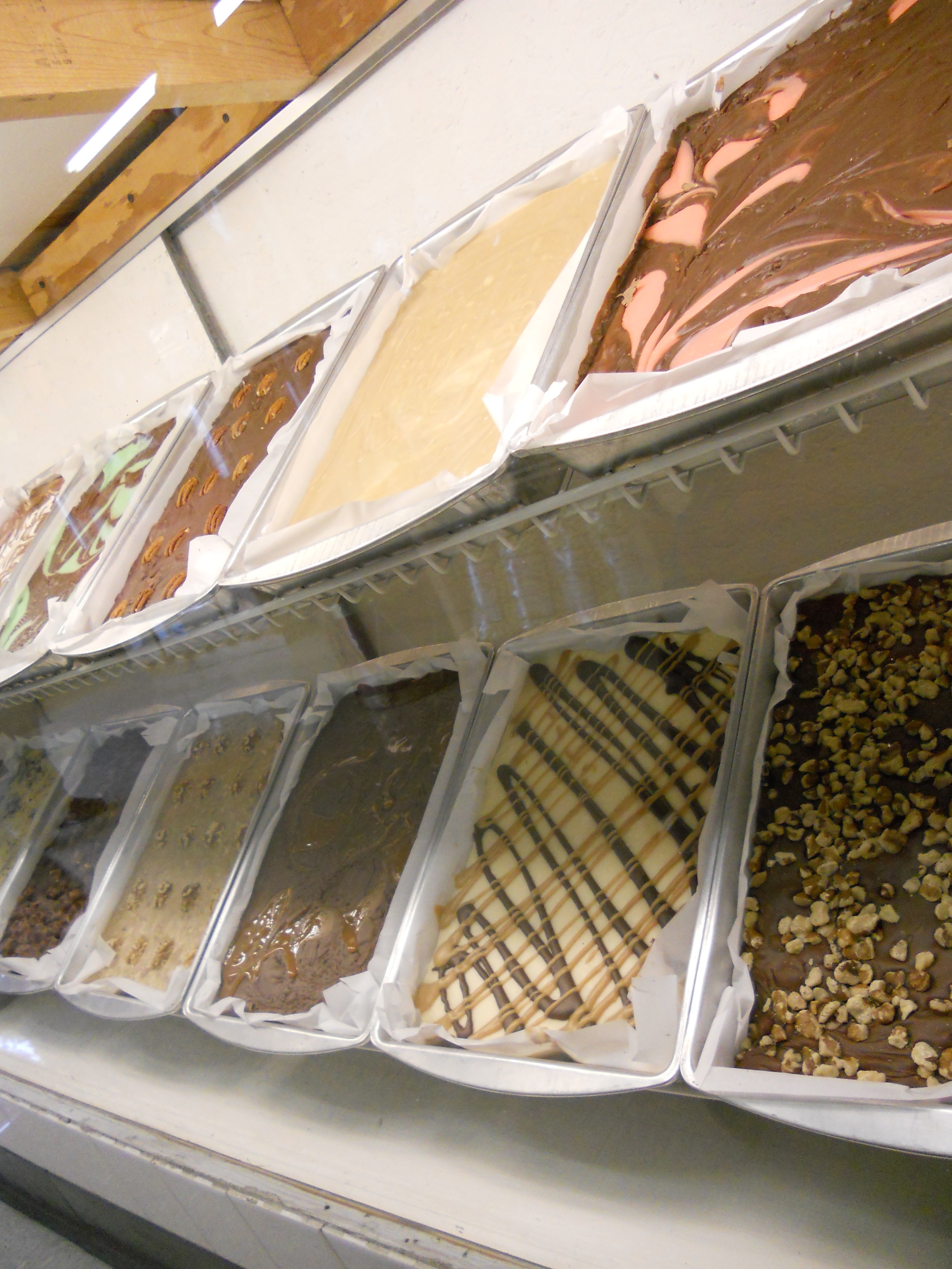 All the details aside, it is just a comfort to be out on the road and see a sign for fudge, pull over, and know you are going to get a sweet treat that comforts your aching body and tired mind and reminds you of the family gatherings and festive holidays of your youth. Ahh, fudge, how do I love thee? In a million different varieties, of course, but mostly in the chocolate peanut butter swirl version!
